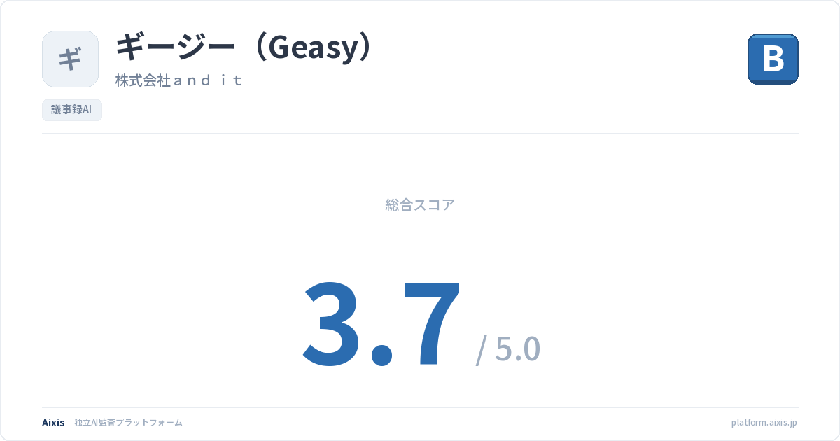 国産ツールとして日本語ビジネス文書の品質に強みを持ち、金融機関(大分銀行)での月間80時間超の工数削減事例など、厳格なセキュリティ要件を持つ組織での導入実績もある。一方、公式に謳う「話者分離正答率100%」については第三者検証で疑義が呈されており、マーケティング上の誇張と見なされるリスクがある。またデータ保持・学習利用に関するガバナンス情報の公開が不十分であり、機密性の高い会議情報を扱う企業は導入前に個別確認が必須。