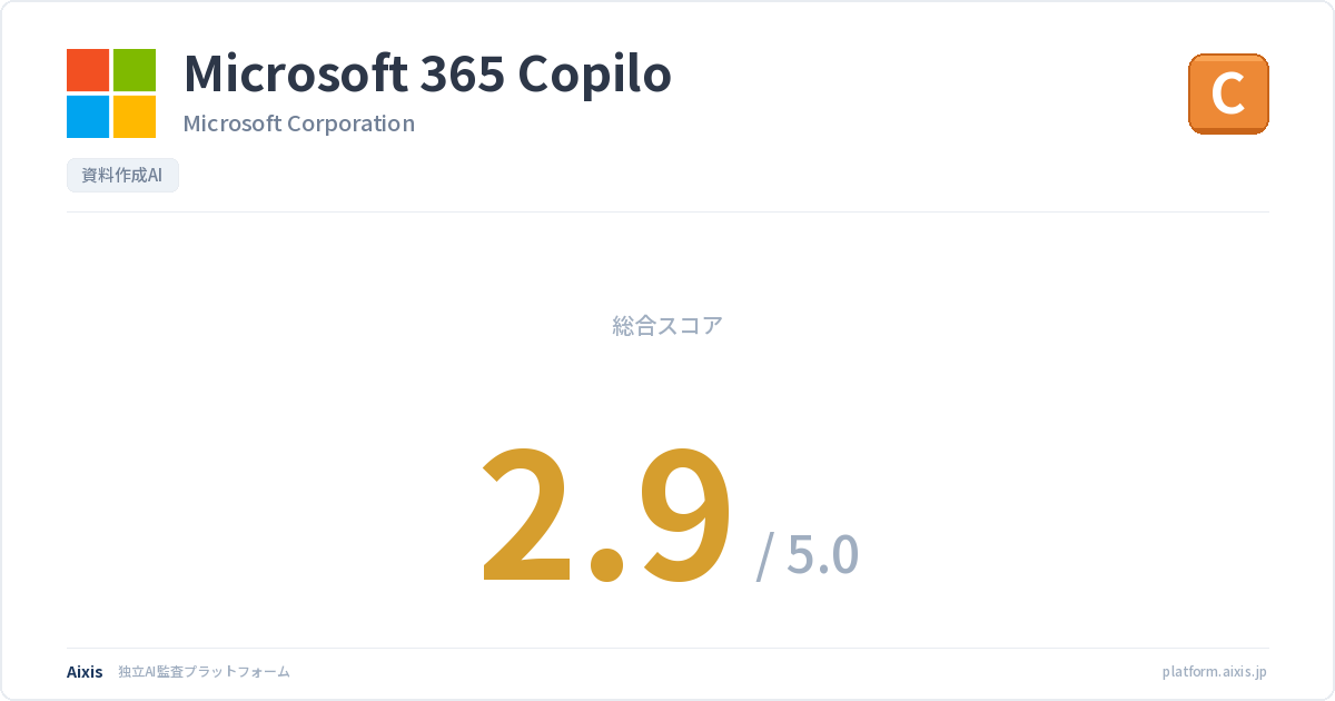Microsoft 365 Copilot は、既存の Microsoft 365 環境に深く統合されており、追加の ID 管理や SaaS 契約を要さずに AI 機能を導入できる点が最大の強みである。一方、利用にあたり Microsoft 365 の有料ライセンスが前提条件となるため、Microsoft エコシステム外の企業には実質的に閉じたソリューションであり、ベンダーロックインのリスクは高い。料金はユーザー単位のサブスクリプションに加え Microsoft 365 ライセンス費用が重畳するため、ROI の把握が複雑になりやすい。エンタープライズ向けセキュリティ(EDP・権限継承・監査ログ)は業界トップ水準だが、AIの応答品質・ハルシネーション対策・利用定着の難しさはサードパーティレビューで繰り返し指摘されており、導入後の変更管理・トレーニングへの投資が成否を左右する。