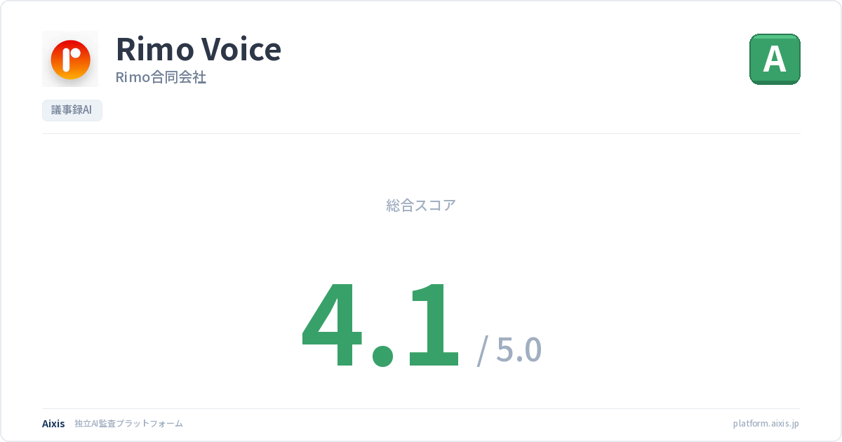 Rimo Voiceは日本語特化の高精度AI議事録ツールとして国内市場で高い評価を受けており、BOXIL SaaS AWARD Winter 2024の議事録ツール部門で複数の称号を獲得し、25万ユーザー・2,000社以上に導入されている実績がある。ISO27001+ISO27017の二重認証取得と国内データ保管・AI学習への非利用の公式明言は、コンプライアンス重視の大企業にとって明確な強みである。一方で、クラウド型のみの提供でありオンプレミス型への対応は不可であるため、インターネット環境のない閉鎖系ネットワークや社内完結を要件とする企業には適合しない。また、Rimo合同会社は従業員40名規模のスタートアップであり、サービス継続性・価格安定性のリスクは導入前に留意すべき点である。