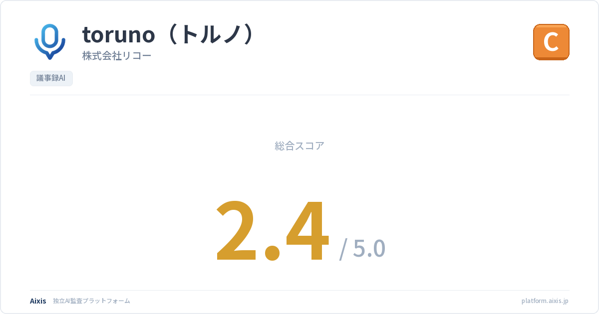 torunoは、複合機・オフィス機器で知られる国内大手・株式会社リコーが提供する会議記録AIサービスであり、国産・日本語特化という点で信頼性の基盤は比較的高い。データはすべて日本リージョンのAWS上に保管され、音声認識AIにはAmiVoice・Azure AI Speech、生成AIにはAzure OpenAI GPT-4oを採用する構成。音声データ・文字起こし結果がいずれのAIにも学習利用されないことが公式に明言されており、この点はプライバシー観点での強みとなる。一方、SSOや監査ログ提供などの機能は現時点では提供されておらず、高度なガバナンス要件を持つ大企業での展開には機能上の制約が残る。秘密保持契約(NDA)の個別締結にも対応しておらず、機密性の高い商談・経営会議での利用には慎重な検討が必要。